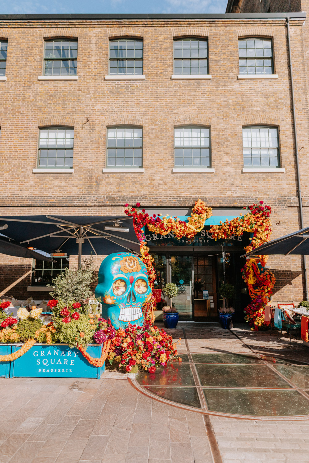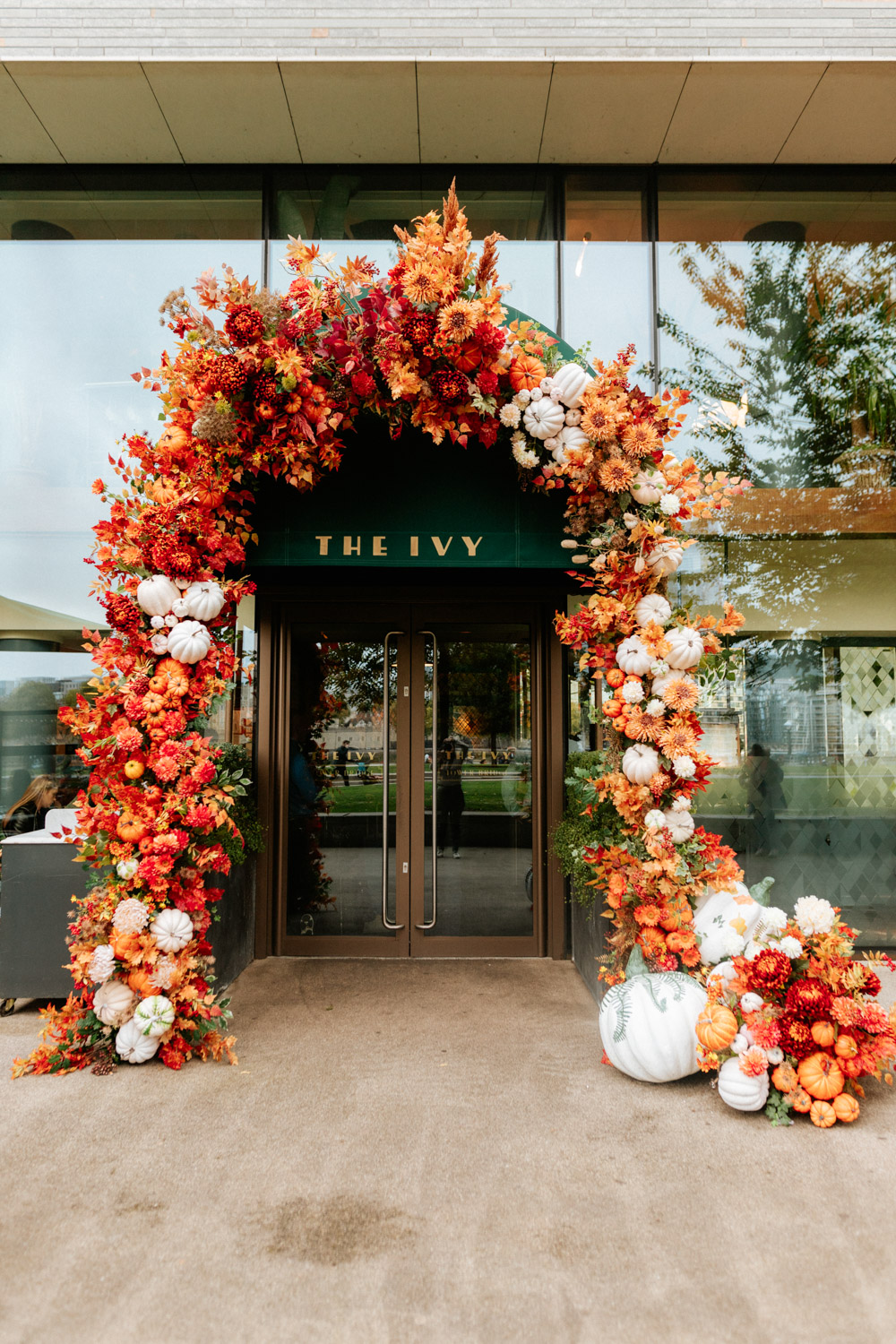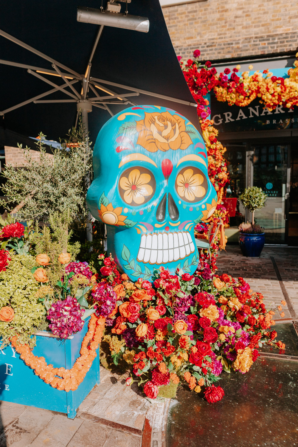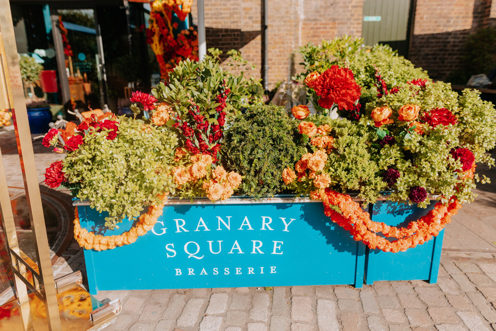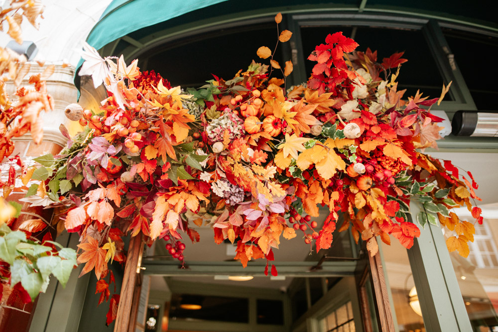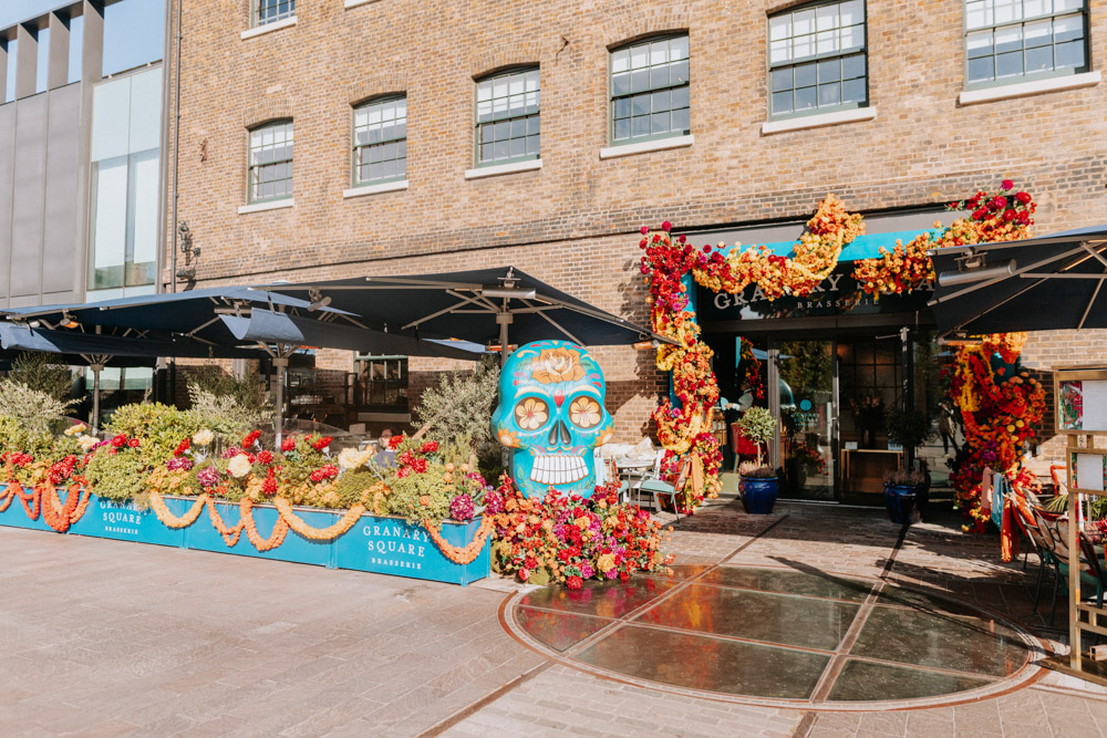 Elsewhere the richness of the season was embraced with fall foliage, ombré orange palettes and falling leaves at Icon Outlet and The Ivy Brighton. New for this year we also had the pleasure of dressing the beautiful Dalloway Terrace ready for their afternoon tea collaboration with designer Olivia Rubin. We channelled the resplendent garden theme with heavy flower coverage in a kaleidoscope of colours. And being able to celebrate Halloween once again kept the team on their toes with a flurry of spooky installations across London. From modern handpainted pumpkins at The Ivy Marlow Garden to Dia de los Muertos inspired decorations at Granary Square Brasserie we enjoyed working on such a range of concepts. There is no rest as we now dive head first into all things festive and without doubt our busiest season of the year!